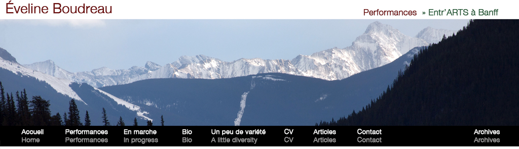 I arrive at the Banff Centre, Banff, Alberta, with the theme of identity, which has been related to my artistic work for many years. It continues in “A Look in time” (Regard dans le temps), my project for Entr’ARTS-2013, a multidisciplinary workshop for francophone artistes organised by RAFA (Regourpement des artsites francophones de l’Alberta). On arriving, I immediately see opportunities to take advantage of the social, urban and natural milieu of the Banff area, a place for performance art to address identity and our relationships with others. I also look for ways to understand and show how we conceive space and time, to establish links between today’s art and people, to do Performance art in situ. Through a series of mini-performances, each conceived according to circumstances, time and location, I interact with people in this milieu.