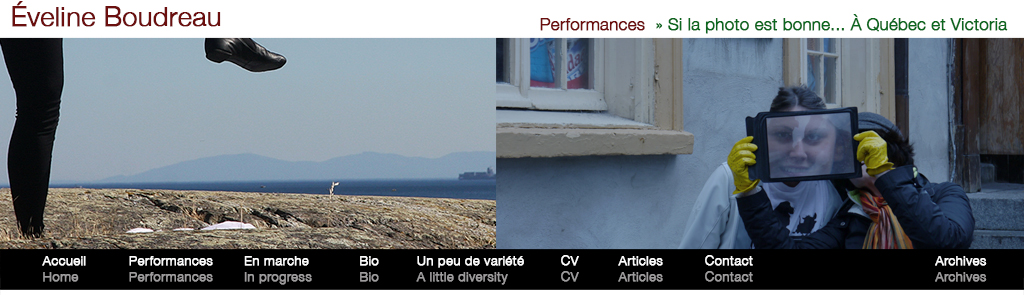 Ce projet débute durant Entr’ARTS-2013, séminaire multidisciplinaire d’artistes francophones organisé par le RAFA (Regroupement des artistes francophones de l’Alberta) au Banff Centre, Banff, Alberta. Il a lieu en 2013 à Banff et se poursuit à Niagara en automne, à Victoria et Québec à l’automne 2014. Il porte sur l'identité et le temps ainsi que sur l’image de soi qui peut être rapidement et facilement transformée.